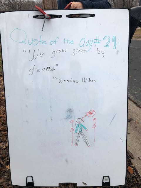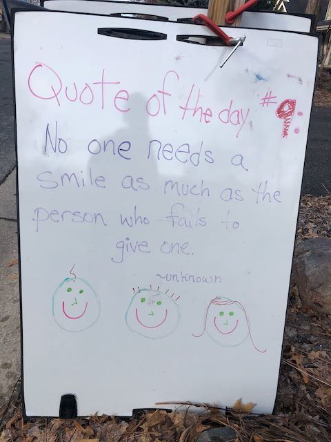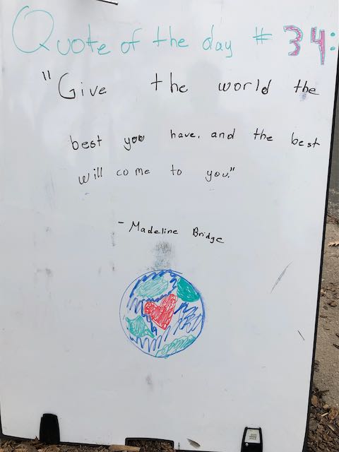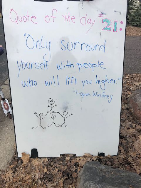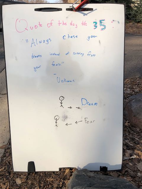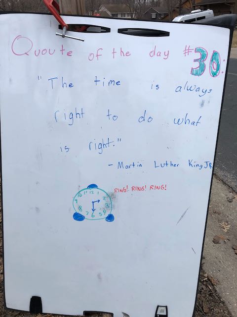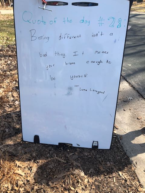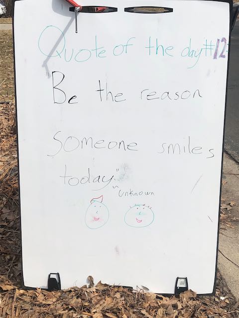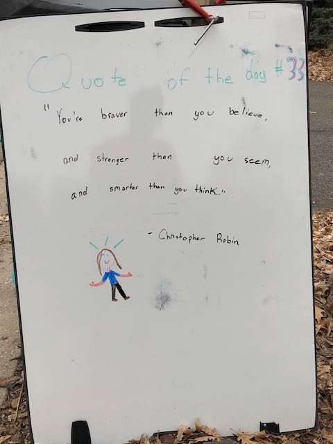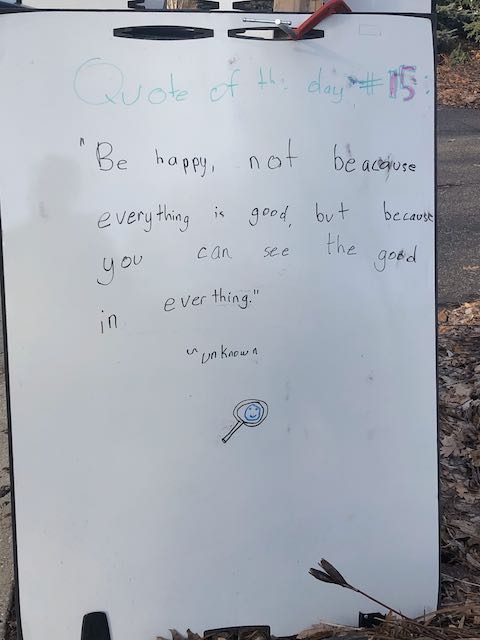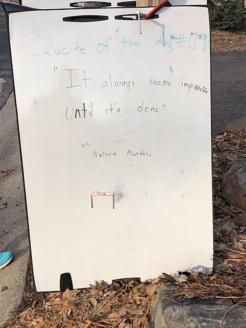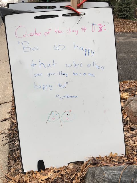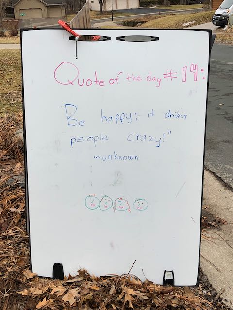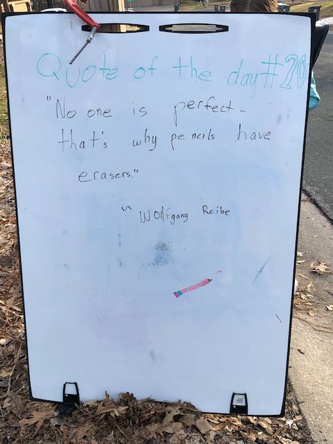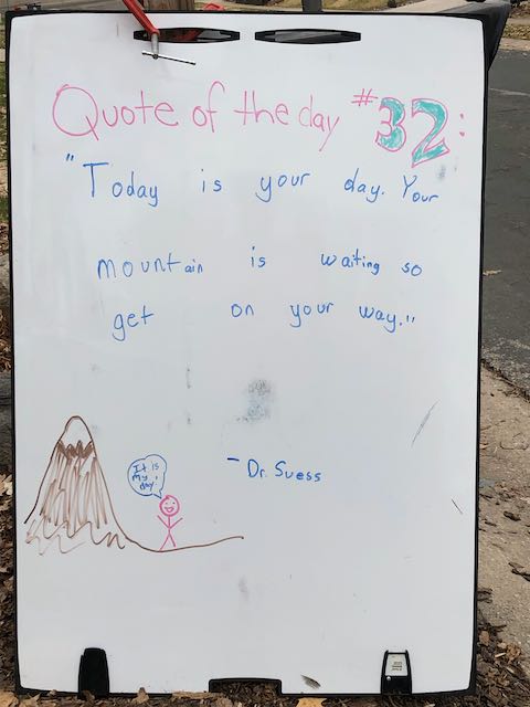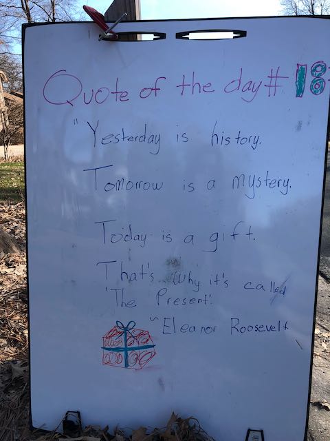 My two daughters decided they’d like to bring light to the neighborhood by posting a Quote of the Day and a related doodle. Thankfully, two large easel style whiteboards survived our big move to Minnesota and have been a fixture at our curb since Mid-March. Enjoy this ‘review’ of the selected quotes.