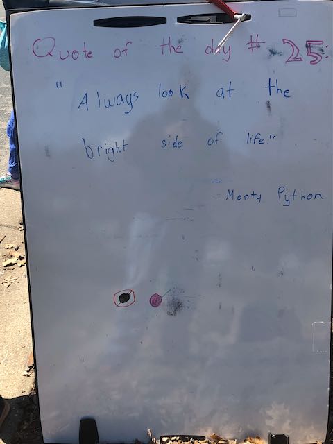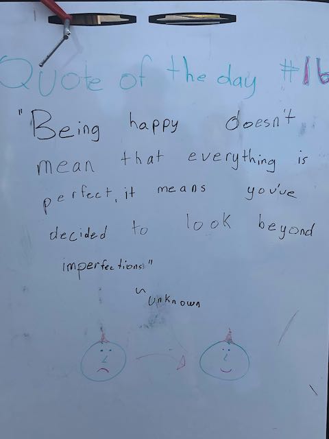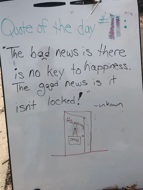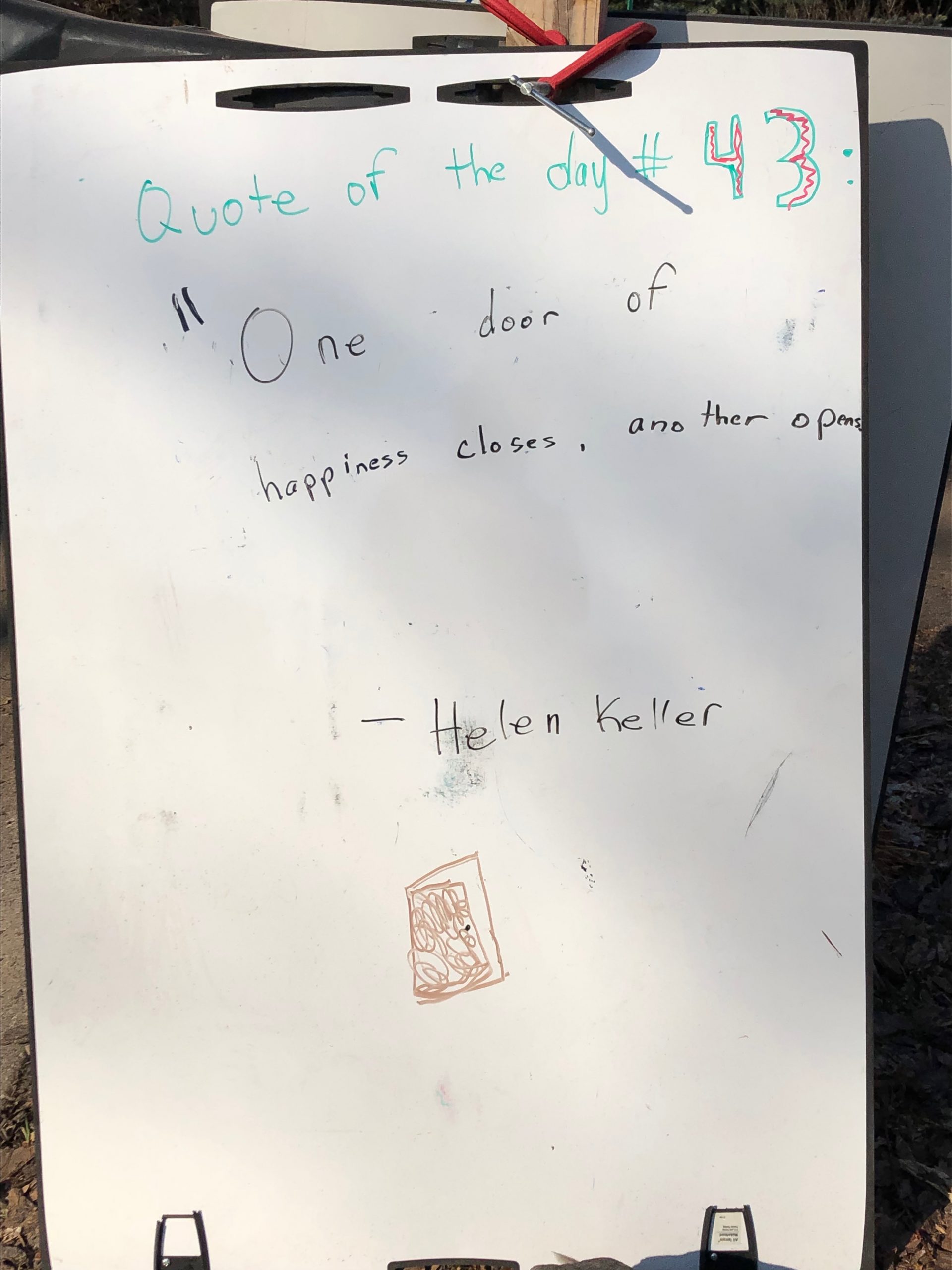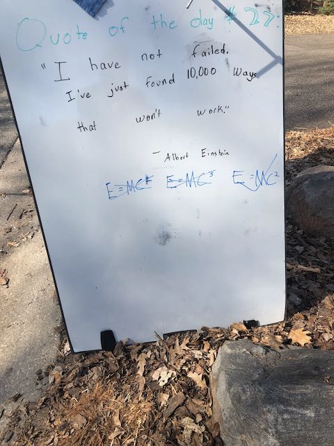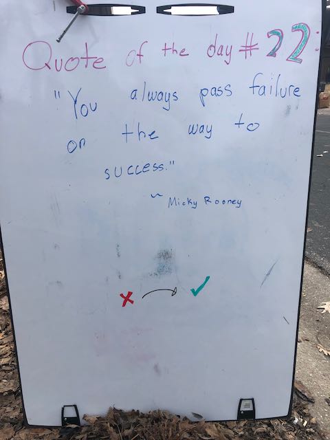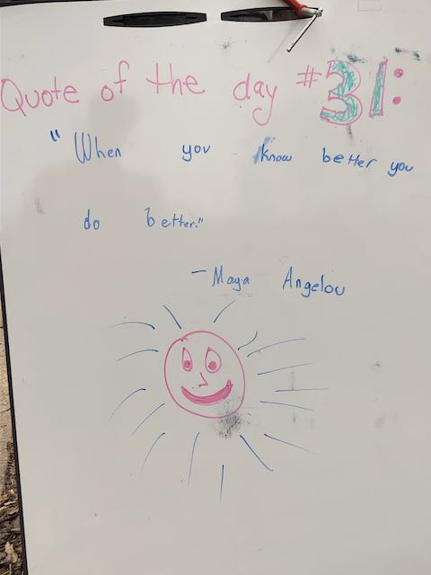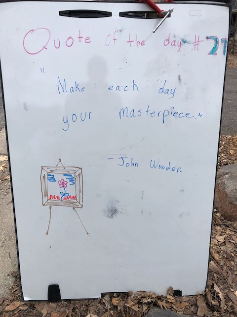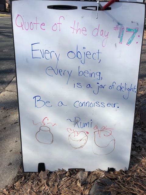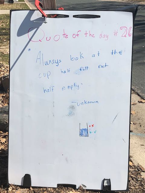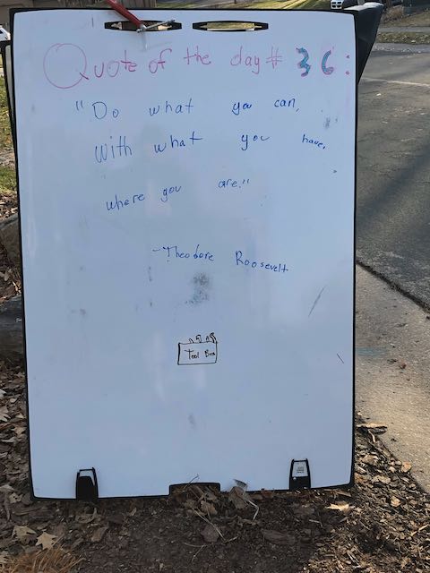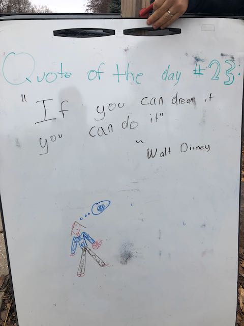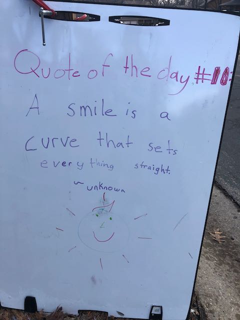 My two daughters decided they’d like to bring light to the neighborhood by posting a Quote of the Day and a related doodle. Thankfully, two large easel style whiteboards survived our big move to Minnesota and have been a fixture at our curb since Mid-March. Enjoy this ‘review’ of the selected quotes.